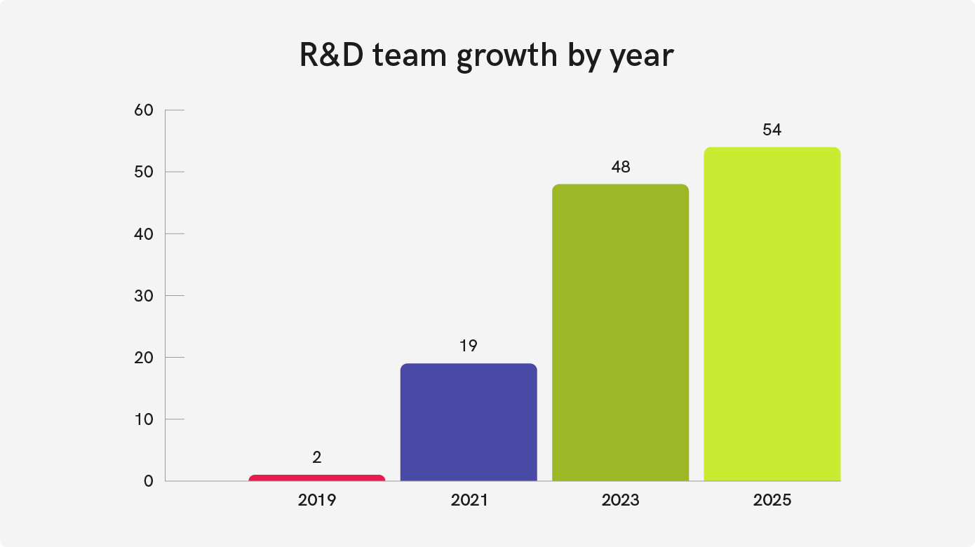 Following the initial success, Orca’s product ambitions grew, as did the complexity of the platform. To support this, we expanded the R&D team by recruiting specialists with diverse skill sets, We’ve reworked this section to avoid disclosing details of the internal team structure while still highlighting their specific functionality - please let me know if even this feels like too much.