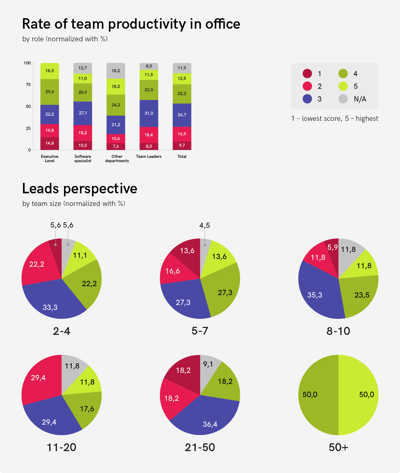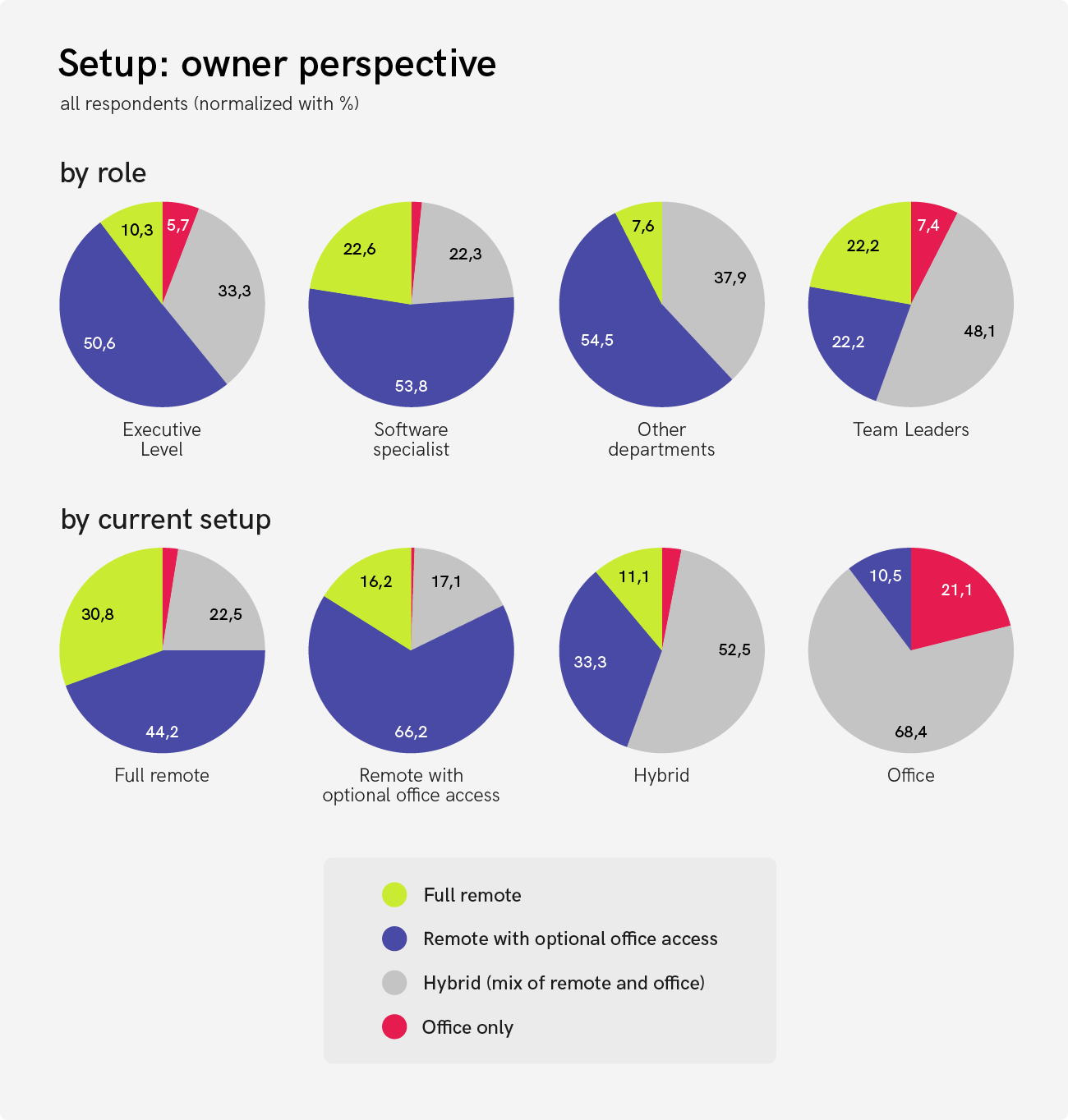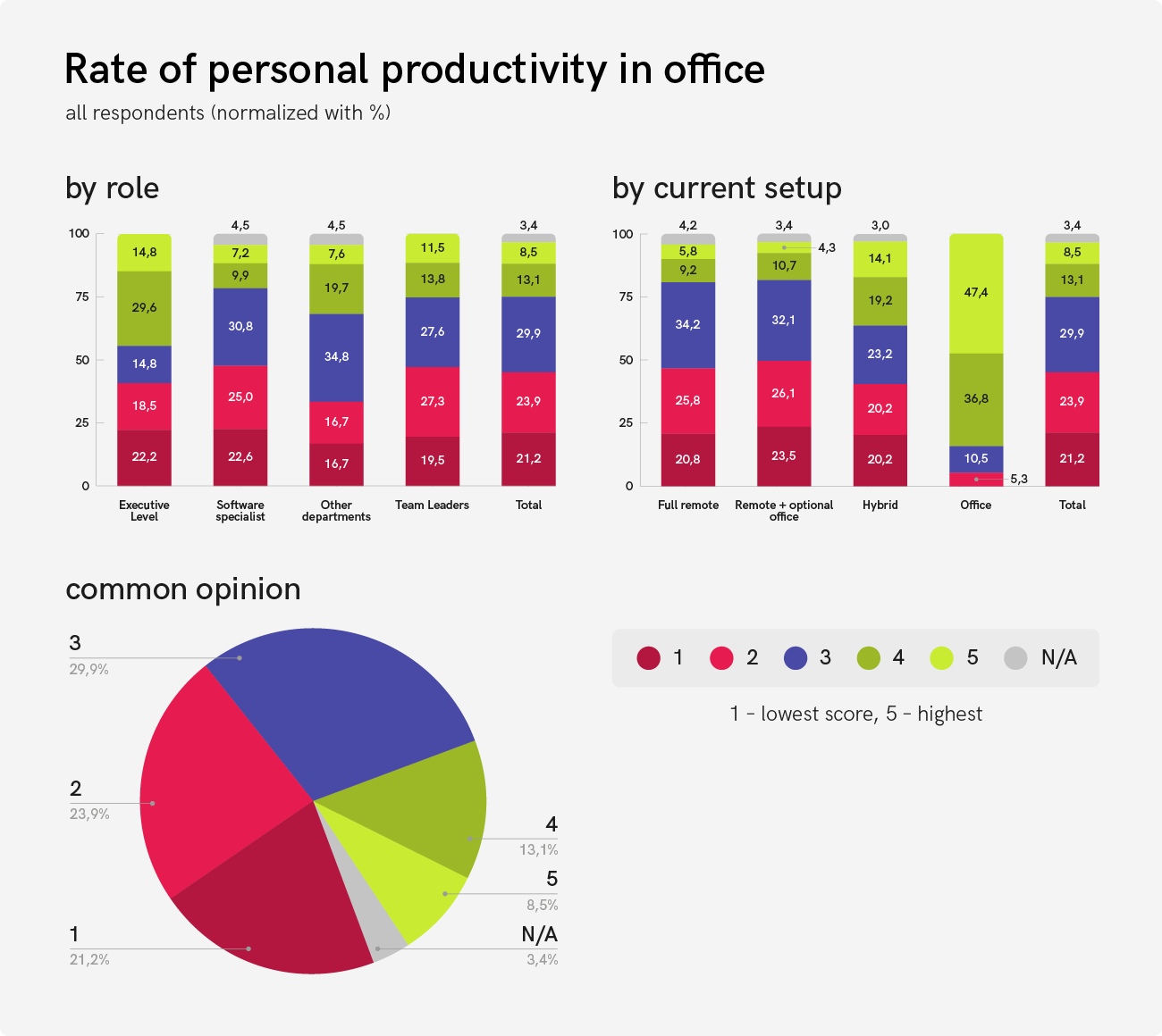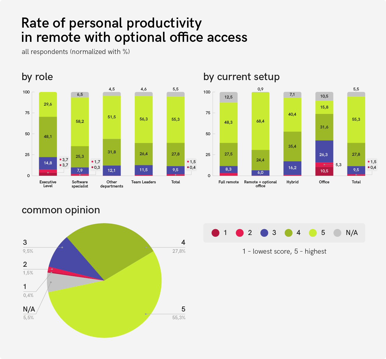 In this section respondents rated how productive they personally felt in different setups. Each group of charts shows both an overall view and a breakdown by role.