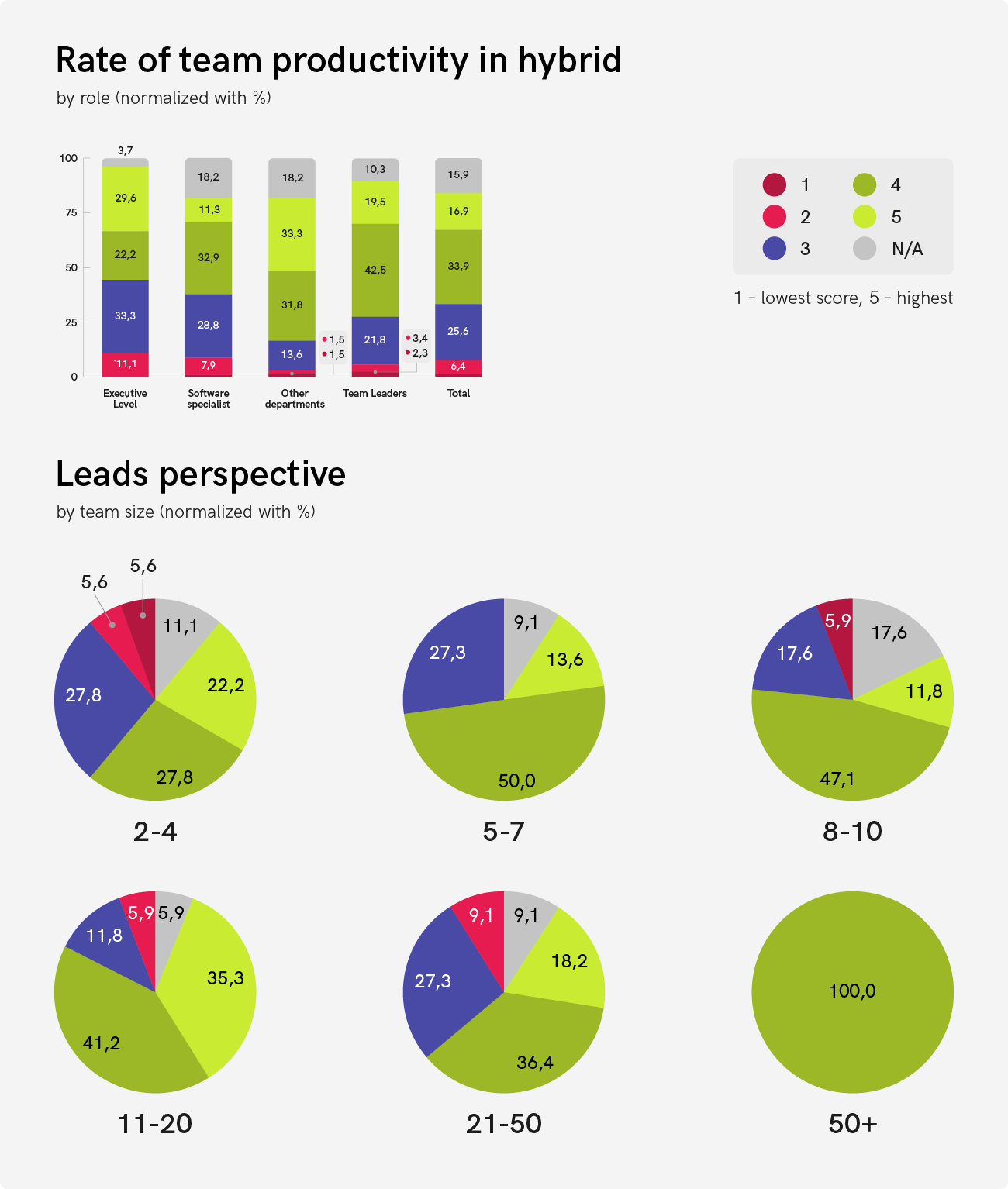 Here respondents evaluated how productive their teams were in each format. We looked both at role‑based results and at how perceptions change with team size.