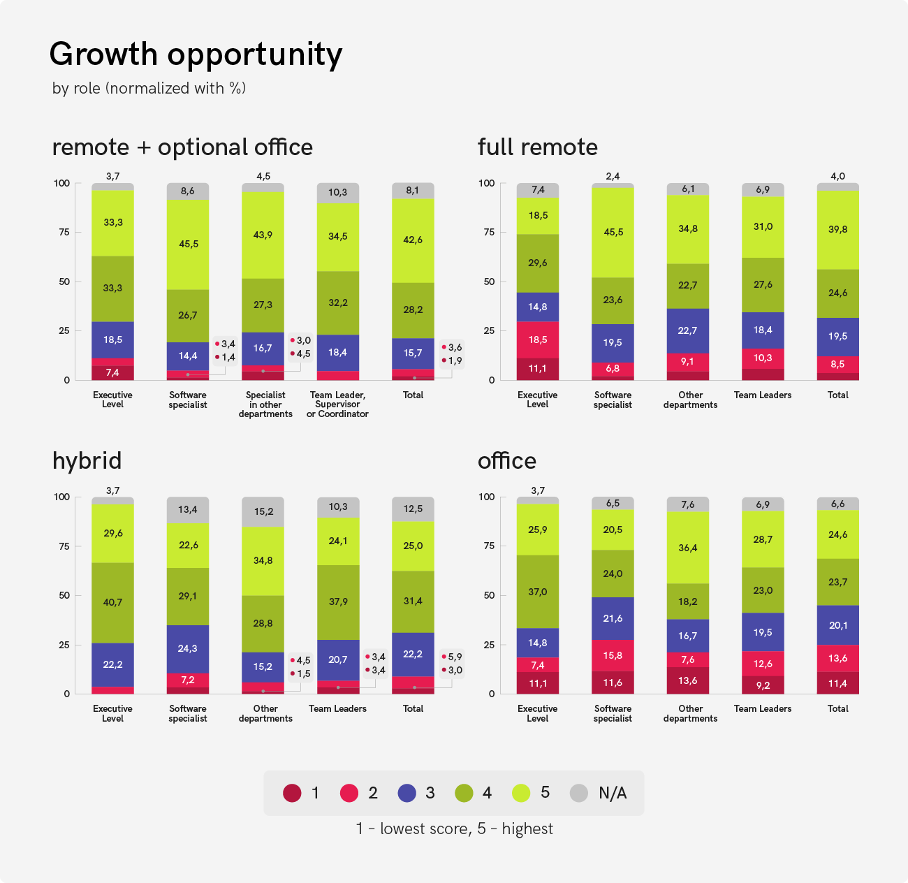All questions where people rated productivity, career growth or meeting effectiveness used a 5‑point scale, where 1 means “very poor” and 5 means “excellent”.